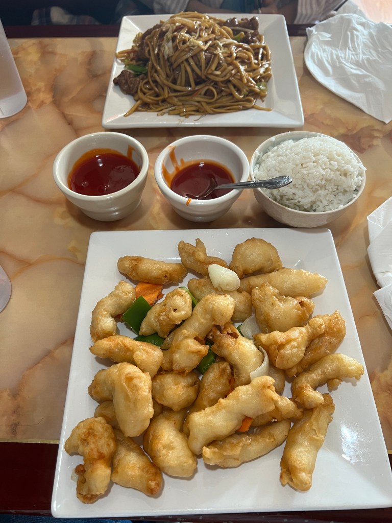 For the main entrees, I had ordered a plate of sweet and sour chicken and a side of white rice, while my girlfriend got beef lo mein as her dish. These plates were PACKED with food, the portions were unbelievably big. If you have read any of my previous posts, I reviewed Thanh Lihn, the Vietnamese restaurant in Campustown and I had mentioned how big the portion sizes were there. The ones here might even be as big, if not a little bigger than there. Neither of us got very far in our food because we were stuffed from how much there was. The food was very tasty though! The sweet and sour chicken was as expected, it didn’t taste like anything out of the ordinary, but it was exactly what it should have been and it was still very good. The beef lo mein, however, was very flavorful, and the beef was cooked very tenderly and if I had to go there again, I would probably order this instead. I was very delighted by how the food was.