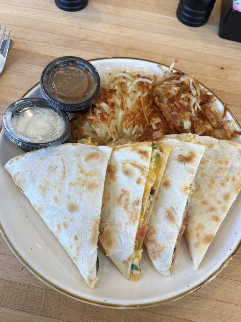 This quesadilla was DELICIOUS! With every bite, it was as if I could taste every flavor and there wasn’t anything that overpowered one another. The tortilla was grilled perfectly so that it wasn’t too crispy, but crispy enough so that it had a nice little crunch with each bite. I think my favorite part about it was the jalapeños added in there because it added that little bit of kick to it that it needed. The hash browns on the side were also cooked very well and had some good flavor to it. There was nothing fancy about the hash browns, but they were exactly what I needed them to be. I will say, the salsa on the side wasn’t my personal favorite, but it didn’t impact me enough to lower my rating of the food because the sour cream on there was a perfect combination.